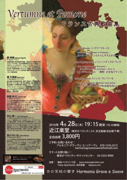 | ヨーロッパ 古の響き Harmonia grave e soave J-B.リュリ『アルミード』 タイトルロール 2015年6月12日(金) 19:30開演(18:30開場) 南青山MANDALA(東京メトロ銀座線「外苑前」駅下車 徒歩5分) チャージ料 ¥4,500(1ドリンクつき) 指揮/クラヴサン:根本卓也 ヴァイオリン:阿部まりこ ヴァイオリン:須賀麻里江 バス・ド・ヴィオール:中山真一 アルミード:堀万里絵 ルノー:安冨泰一郎 イドラオ/ユバルド:加藤宏隆 シドニー:東伸美 フェニース:樋口麻理子 |