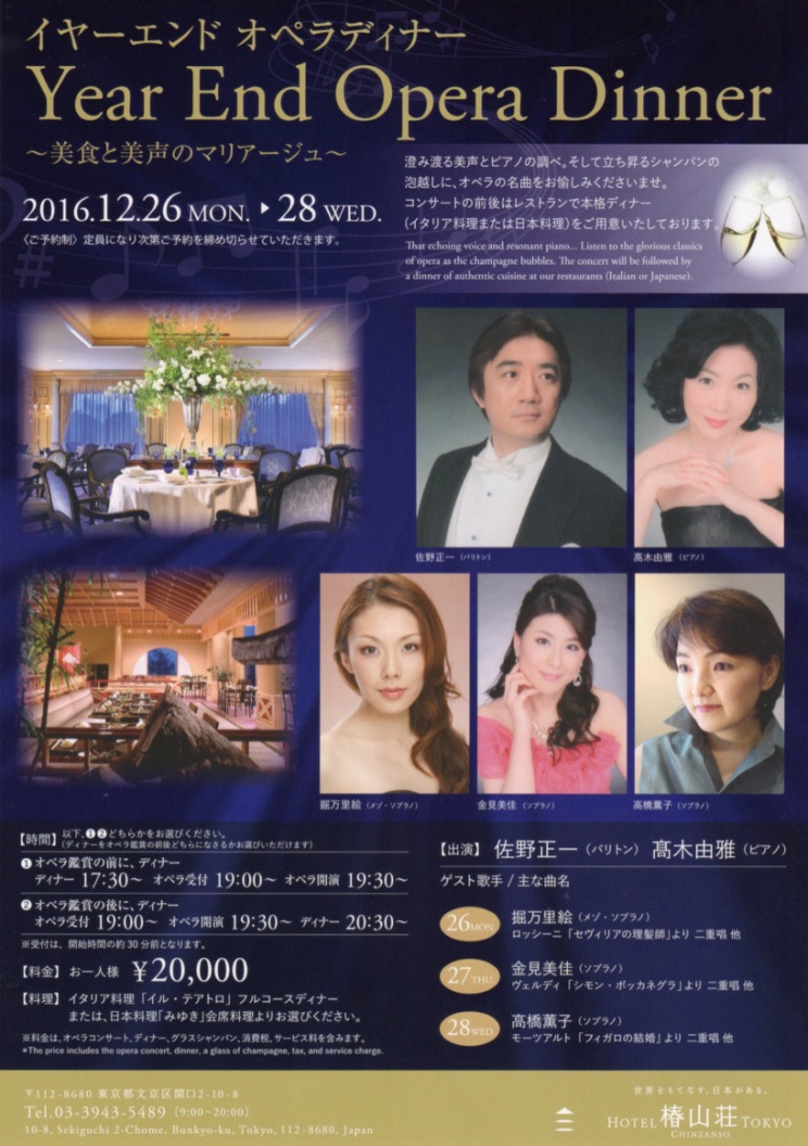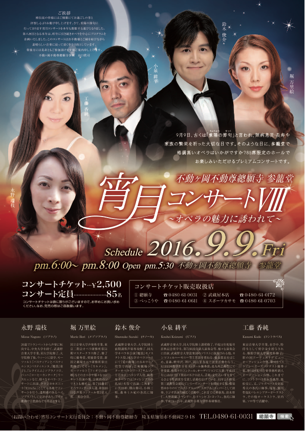 | 宵月コンサート 2015年9月9日(水)18:00開演 埼玉県加須 總願寺 自由席 ¥2,500 定員85名 出演 永野瑞枝(ソプラノ) 堀万里絵(メゾソプラノ) 加藤史幸(バリトン) 小泉耕平(ピアノ) 工藤香純(コントラバス) チケット取り扱い 總願寺 0480−61−0031 他 |