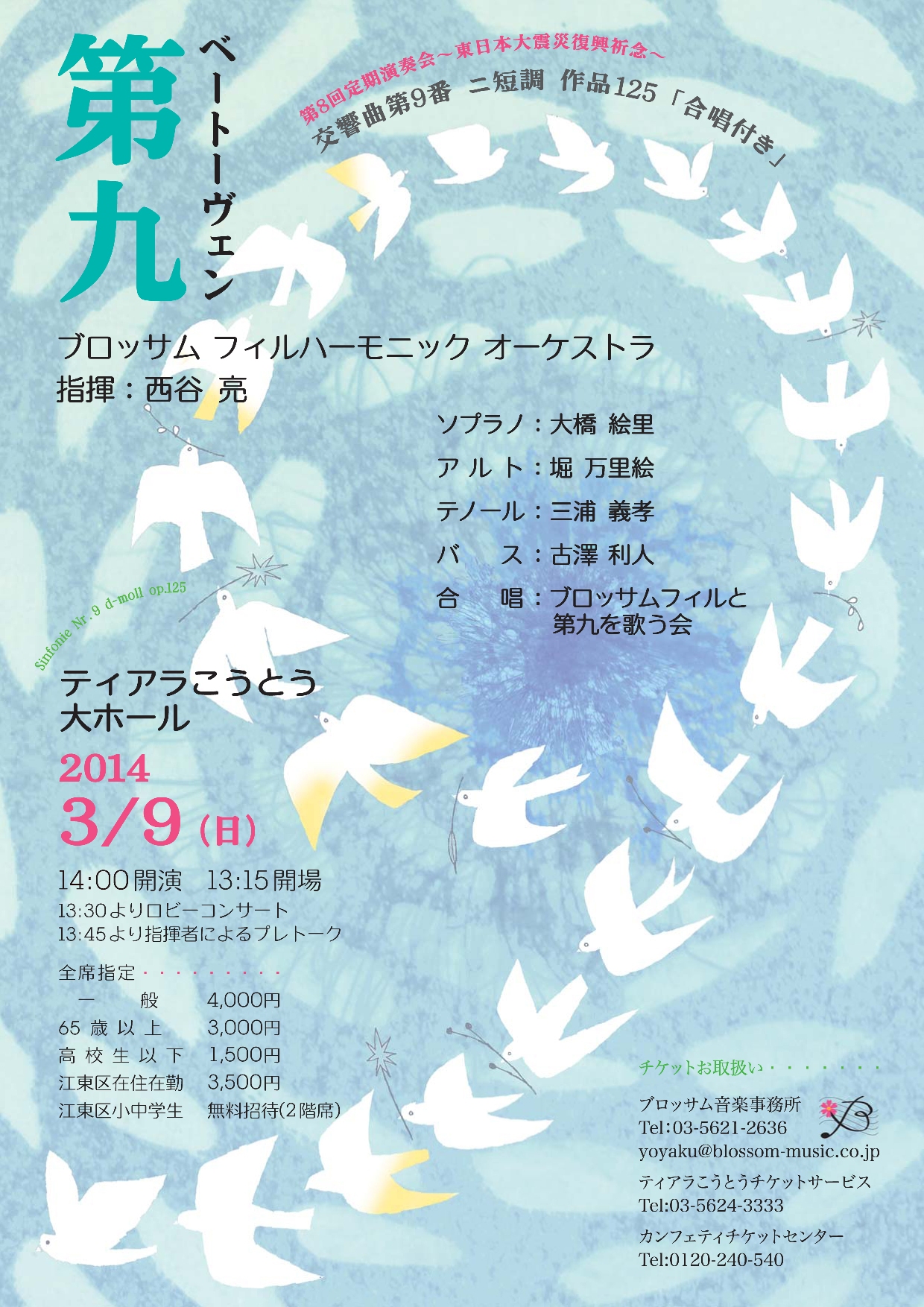 ベートーヴェン『交響曲第9番 合唱付き』 2014/02/13(Thu) [お知らせ] Comment (0) みなさま年末のイメージが強いと思いますが。 『第九』です♪ ※クリックで大きくご覧いただけます。 ブロッサムフィルハーモニックオーケストラ 第8回定期公演 東日本大震災復興祈念 ベートーヴェン『交響曲第9番 合唱付き』 2014年3月9日(日) 14:00開演 (13:15開場) ティアラこうとう 大ホール 【チケット】 全席指定 一般:¥4,000 65歳以上:¥3,000 高校生以下:¥1,500 江東区在住在勤:¥3,500 江東区小中学生:無料招待(2階席) ※13:30より ロビーコンサート ※13:45より 指揮者によるプレトーク 【出演】 指揮:西谷 亮 管弦楽:ブロッサム フィルハーモニック オーケストラ 合唱:ブロッサムフィルと第九を歌う会 ソリスト ソプラノ:大橋 絵里 アルト:堀 万里絵 テノール:三浦 義孝 バス:古澤 利人 ★★★★★★★★★★★★★★★★★★★★★★★★★★★ 東日本大震災復興祈念。。。 あれからもう3年が経とうとしてるんですね。 色々自分自身にも変化はあったけど、今こうして歌っていられる環境を考えると、普通に生活出来ることが、なんて恵まれているんだろうと改めて感じます。 ハ音記号が読めない とか アレンジが追いつかない とか 寒くて家から出たくないとか 着て行く服が決まらない とか そんな小さな事いってられませんね。 がんばります。 ちなみにそろそろ雛祭りです。 実家の母から 「飾ったよー」 と写真が届きました。 パカパカ携帯で撮ったっぽいので、画像は悪いんですが… わたし、実はずっと不満があったんです。 どうしてわたしのお雛様はお扇子を開いていないんだろう…って。 ほら、こんなやつ。 髪型も2つ結いだし、もしかして時代設定?とかによって違うのかしら??? これは去年のお写真★ 4段目に置いてある【万里絵】の絵馬的なやつ(名称が分からん!)はオルゴール。 もう古くて、ネジまいても あの雛祭りのメロディーがブッツブツと途切れてしまうけど、自分のお雛様っていくつになっても嬉しいですね。 えぇ、たとえ30代でも、女の子♪♪♪ 今年も実家に帰って直接見ることは出来ないけど、ちゃんと毎年飾ってくれるマリママ、マリパパ。 どうもありがとう。 お雛様を見ると気分が春モードになりませんか? 週末はまた大雪予報ですが… 早くあったかくならないかなぁ~!!!! ほりまりえ PR