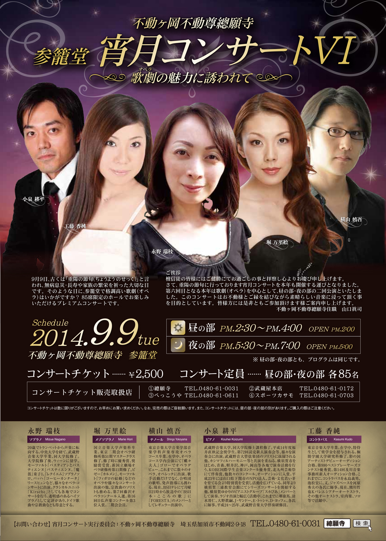 今年も宵月コンサート 2014/08/18(Mon) [お知らせ] Comment (0) こんばんは。 引っ越し荷物に囲まれ、そろそろ現実逃避に走りたくてウズウズしているまりえです。 明日は朝から稽古3つ! そして明後日はお引越し! 今日これからが荷造り本番です。 さてさて、私は無事に引っ越せるのでしょうか・・・。 そして明日一番のお稽古は 宵月コンサート♪ 昨年もお世話になりました、不動ヶ岡不動尊總願寺さんで演奏させて頂きます。 私は、サムソンとデリラより ~私の心はあなたの心に花開く~ をメーンに、他にもちょこちょこと歌います。 夜の部はすでに完売??!! 頑張らねばっ!! 明日の10時から2度目の合わせ。 10時・・・。 恐ろしい。。。 今日は早く作業が終わりますように。 ではっ!!! ほりまりえ PR