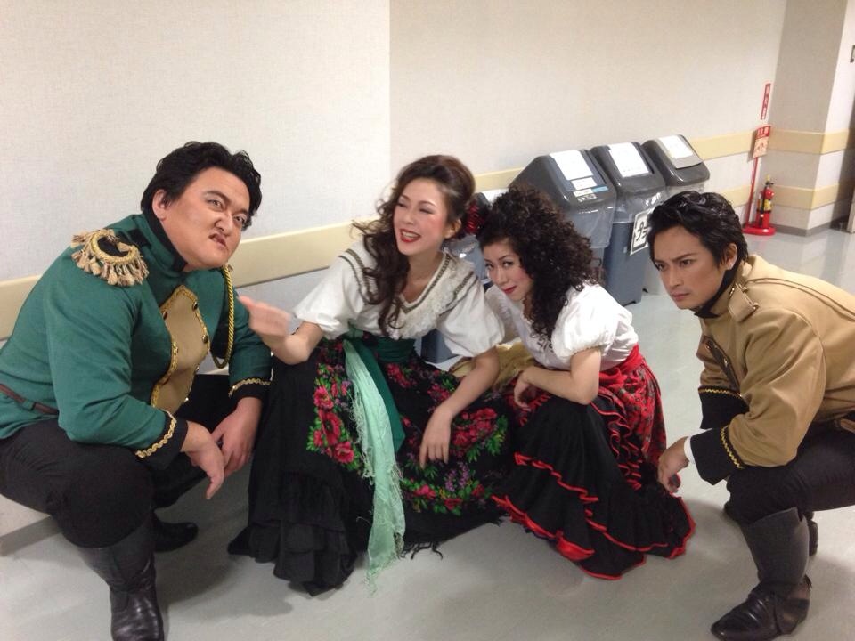 まりえカルメン 2014/09/05(Fri) [歌いました☆] Comment (1) こんにちは。 先週のびわ湖カルメンのご報告もあるのですが、思うところがあったので、昨日の本番と合わせて。 昨日はゲスト出演でカルメンのハイライトをさせていただきました。 カルメンとホセとエスカミーリョで。 グリダーレは以前から何度もご一緒している、肉食系歌手、上本訓久さんと今井俊輔さんのユニット。 彼らとはカルメンもハイライトで何度かご一緒していて、演技もちょっとした打ち合わせで出来るくらいやり易いのです♪ お二人は午後の公演も、何と別プログラムでこなして、最後の最後にカルメン。 しかもアンコールを計4曲も。 さすが肉食系。 打ち上げもやっぱりお肉でした。 さてさて、 今回のまりえカルメンはいつもと違いました。 何でって、びわ湖で森山さんのカルメンを目の当たりにしていたからですかねぇ。。。 私には無いワイルドな強さと愛にすごーく憧れがあって。 カルメンって女性は原作を読むと、今の美意識では、絶世の美女ではないのかな…?と思うのです。 鼻は大きくて、目は斜視だけどくりっとしていた とか。 でもカルメンはその存在だけで魅力的で、何もしなくても周りが放っておけない存在なんですよね。 色っぽく演じるのは、もしかしたら違うのかもしれない。。。 自然な姿が色っぽいんだよね~ とか、色々考えていつもゴチャゴチャしてしまうんです。 で、話は戻りますが、要は誰もが納得できる圧倒的な存在感がカルメンにはあったと思うんですよ。 常に一人だけピンスポ当たってるような。 森山さんのカルメンは、どこにいても光っていて、強烈だけどあったかい存在で、同じ舞台に立っていて幸せでした。 私は背は大きいけど 少し器用かもしれないけど それに頼ってばかりじゃ駄目なのね 少しでも万里絵カルメンがこれからピカッと光ればいいなと思います。 そんな思いを抱えていたら、3日のカルメンハイライトは少し違う感覚がありました。 後で振り返ると、ちょっとだけカルメンとして感じた気持ちとか反応とか。 『この時はこう感じている』と自分の中で決めつけていたものがゆるくなって、新鮮な感情を味わえた感じ。 正解かどうかはわからないですけど、ステージからでも、お客様が凄く集中して見て、聞いて下さっているのが伝わってきたので、私にとっては素晴らしい本番でした。 ご来場頂きましたグリダーレファンの皆様。 上様、今井っち、そしてピアニスト結ちゃん。 スタッフの皆様。 ありがとうございました。 写真はびわ湖でのカルメンより。 やっぱり自分ではパチリしなかったので頂き物ばかりですが。 カルメンの愉快な仲間達ですw フラメンコの娘さん方。 10才くらい違う・・・みなさんピチピチでした。 踊りも格好良かった! そして我らがカルメン、森山京子さんを囲んで。 フラスキータの江口二美さんは頼れるお姉たま。 とにかく充実した週末となりました。 東京でも打ち上げしたい~と舞い上がっております。 中橋マエストロ、演出の池田理代子さんと一緒に。 ソリスト全員集合です。 みなさま本当にお世話になりました。 そして立命館大学のコーラス、オーケストラ、児童合唱、そしてフラメンコの皆さん。 2日前から合同でのリハーサルをさせていただきましたが、どんどん進化していって、みんな楽しそうで、とっても素晴らしかったです! 本番成功おめでとうございます。 また、素敵な舞台でのびのびと演奏させて頂けて、支えて下さるスタッフさんあってこそと改めて感じました。 舞台に上がる者として恥ずかしくないよう、これからも精一杯頑張ります! みなさまありがとうございました。 そんなこんなで、引越しの荷物もなんとか楽譜以外は片付き、PC触れるようになりました。 ちょこちょこですが、ブログもまた書きためていこうと思います。 これからも どうぞお付き合い宜しくお願いいたします★ ほりまりえ PR