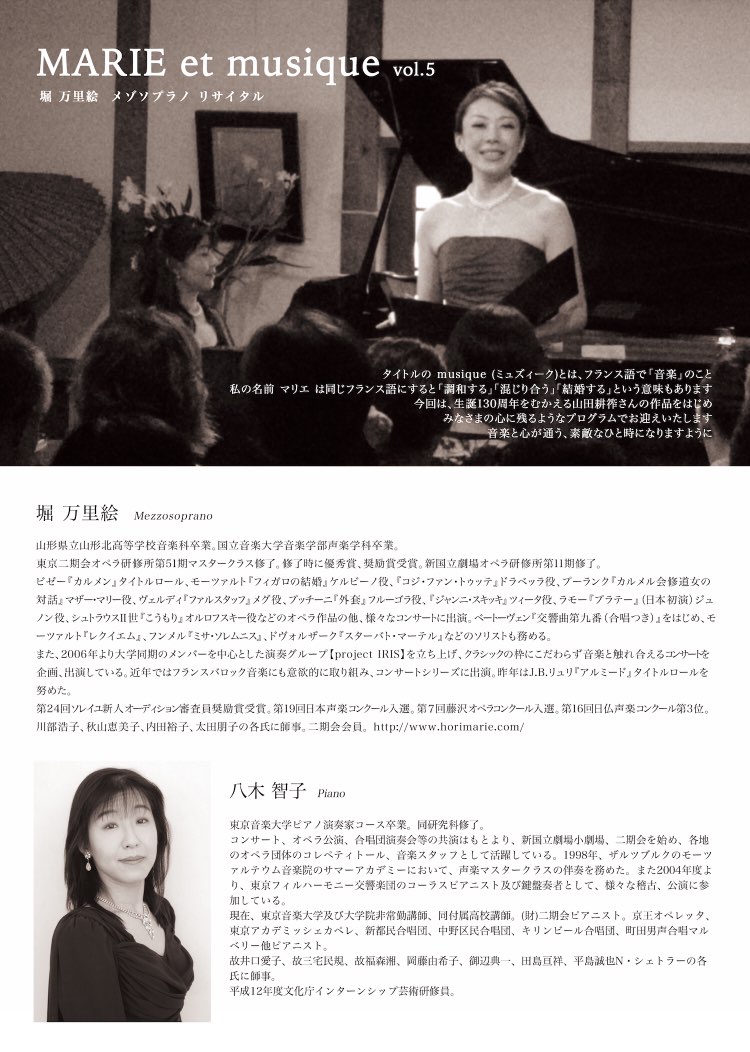 もう目の前だぜ、リサイタル! 2016/11/01(Tue) [お知らせ] Comment (0) 慌ただしく過ごしていたら、もう目前に迫りました。地元でのリサイタル。リサイタルといっても、クラシック初めての方でも楽しんでいただけるように試行錯誤しております。毎回反省する、まりえMCも見ものではないでしょうか。先日ある人に「まりえさんはMCが普段とキャラが違うんですね」と言われました。ちょっとおすまししてるんだそうです。そりゃ、しますよね!だってオフィシャルな場ですもの。でも時々ポロリとメッキが剥がれる瞬間は、愛嬌があってよいのだと思います。(自分で言いましたけどねw)歌はしっかり真面目に歌いますよ〜。眠くならないプログラム!これ、常に目標です。11/5(土)14:00より、山形市文翔館 議場ホールです。間近ではありますが、お近くの方で興味がありましたらぜひご連絡ください♡近況ですが、家のシロアリ問題が発生しまして、先週プチ引っ越しをしました。旅から帰ってすぐです(p_-)一番の問題は、Wi-Fiが今のお引っ越し先に届かないこと。(プチ引っ越し先は目と鼻の先なのに……。)何かPC作業が必要な時はパソコン片手に旧宅へ。楽譜や鍵盤も置いたままなので、しょっちゅう行き来はするのですが、、、ネット環境の有り難みを思い知りました。 ほりまりえ PR