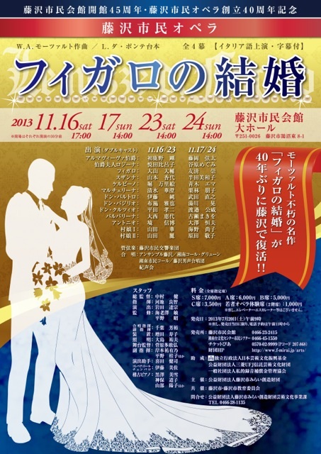 藤沢市民オペラ『フィガロの結婚』 2013/09/30(Mon) [お知らせ] Comment (0) 立ち稽古が始まりました☆ 藤沢市民オペラ モーツァルト『フィガロの結婚』です♪ キャストも豪華★ たのしいたのしいお稽古の時間です。 藤沢市民オペラは、現在数多ある市民オペラの先駆けとなった団体で、今回の『フィガロの結婚』は第一回目の公演で上演された記念すべき作品との事です。 当時は日本語上演だったそうですが、今回は言語(イタリア語)でのノーカット!! バジリオのアリアも、マルチェッリーナのアリアも演奏されます。 勿論セッコ(レチタティーヴォ:セリフの部分)もノーカット。 出演者割引ございます。 お時間ありましたら是非是非おいで下さいませ。 昨年とはまた違ったケルビーノ君をお見せできるとおもいます♪ 2013年11月16日(土)17:00開演 2013年11月23日(土)14:00開演 藤沢市民会館 大ホール 【チケット】 S席:¥7,000 A席:¥6,000 B席:¥5,000 C席:¥3,500 ※出演者割引ございます 指揮:河地良智 演出:岩田達宗 アルマヴィーヴァ伯爵:初鹿野剛 伯爵夫人ロジーナ:悦田比呂子 フィガロ:大山大輔 スザンナ:山本香代 ケルビーノ:堀万里絵 マルチェッリーナ:清水香澄 ドン・バルトロ:伊藤純 ドン・バジリオ:布施雅也 ドン・クルツィオ:平田孝二 バルバリーナ:大西恵代 管弦楽:藤沢市民交響楽団 今日は帰りの電車で面白い動画を見つけました。 conduct us カーネギーオケ 一般の方の指揮でテンポがずれるのも前提にリハーサルまでしているそうです。 曲は『フィガロの結婚序曲』★ マエストロ達のユニークな指揮も素敵。 私もやりたーぃ!!! ほりまりえ