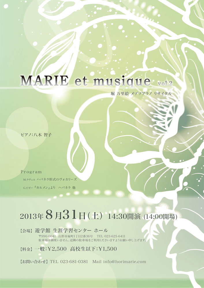 まりえリサイタル 2013/08/16(Fri) [お知らせ] Comment (1) お久しぶりです。 今年の暑さは異常ですね。 すっかり夏バテ気味ですが、やっと夜も涼しくなりだして、復活の兆しが見えてきました。 さてさて、お知らせです。 地元山形で3度目のコンサートをさせて頂きます。 前回は愛をテーマにお話しを交えてのプログラムでした。 今回は自然をテーマに、お花や草木が踊りだしそうな楽しい、かわいらしい曲をたっぷりご用意してみました♪ 外国の可愛い曲もご紹介したいので、朗読もしてみようと思います。 昨年ご好評頂いたミュージカルナンバーも♪ MARIE et musique vol.2 堀万里絵 メゾソプラノ リサイタル (画像クリックで大きくご覧いただけます) 2013年8月31日(土) 14:30開演(14:00開場) @遊学館 生涯学習センター ホール (山形市緑町1-2-36 TEL 023-625-6411) 【料金】 一般:¥2,500 高校生以下:¥1,500 全自由席 【お問い合わせ】 info@horimarie.com 今年はお盆も帰省できず、アスファルトにジリジリ光線の東京で過ごしていますが、いつも山形に帰るとホッと息がつける気がします。 (山形も盆地なので、猛烈な暑さなんですけどね。) 東京で大きな舞台に立てるのも勿論大事ですが、生まれ育った山形で歌を聴いてもらえるのはまた格別です♪ 山形の皆様。 お時間ありましたらご連絡頂けると嬉しいです☆ 宜しくお願いいたします。 ほりまりえ PR