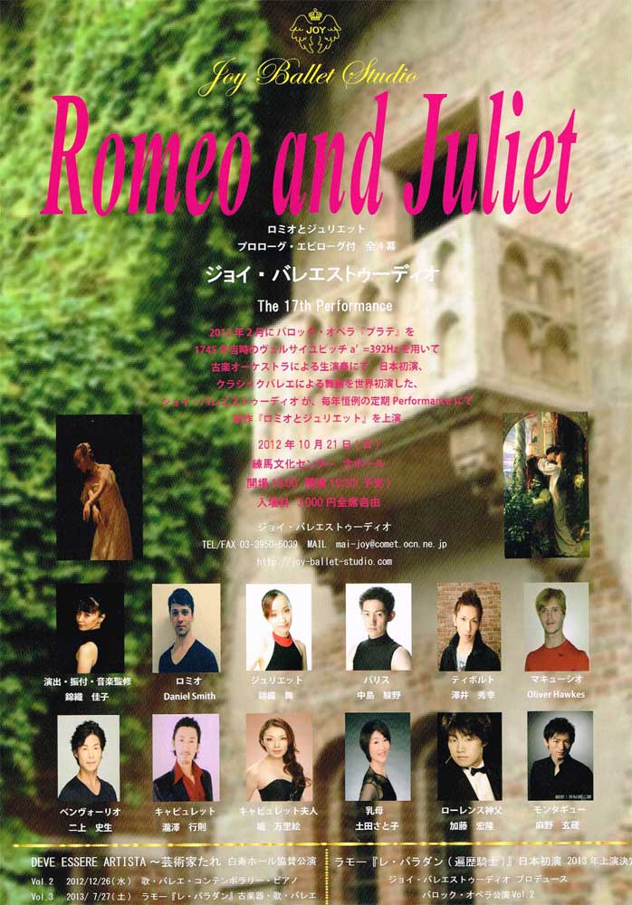 プロコフィエフ『ロミオとジュリエット』 2012/09/12(Wed) [お知らせ] Comment (0) ジョイ・バレエストゥーディオ The 17th Performance 『ロミオとジュリエット』 プロローグ・エピローグ付 全4幕 2012年10月21日(日) 16:30開演 (16:00開場) @練馬文化センター 大ホール 入場料:¥3,000 (全席自由) 原作:ウィリアム・シェイクスピア 音楽:セルゲイ・プロコフィエフ 芸術監督:錦織佳子 【出演】 ロミオ:Daniel Smith ジュリエット:錦織舞 パリス:中島駿野 ティボルト:澤井秀幸 マキューシオ:Oliver Hawkes ベンヴォーリオ:二上史生 キャピュレット:滝澤行則 キャピュレット夫人:堀万里絵 乳母:土田さと子 ローレンス神父:加藤宏隆 モンタギュー:麻野玄蔵 【お問い合わせ】(ジョイ・バレエストゥーディオ) TEL / FAX :03-3950-5039 MAIL:mai-joy@comet.ocn.ne.jp http://joy-ballet-studio.com ※チケットのお求め、お問い合わせは上記問い合わせ先、若しくは私まで直接ご連絡下さい。 2月のオペラ『プラテ』でお世話になりましたバレエスタジオさんの公演。 今回は歌わずに、演技で参加させて頂くことになりました。 だってバレエ公演ですものね。 こんな日が来るとは夢にも想っていませんでした。 お稽古に参加させていただいていて思うのが 皆さん本当に明るくて楽しい! 真剣に取り組むのは勿論ですが、スタジオの空気がとにかく和やかで、毎回通うのが楽しみです。 本番まで あと一ヶ月と少し。 頑張るぞー!!! ほりまりえ