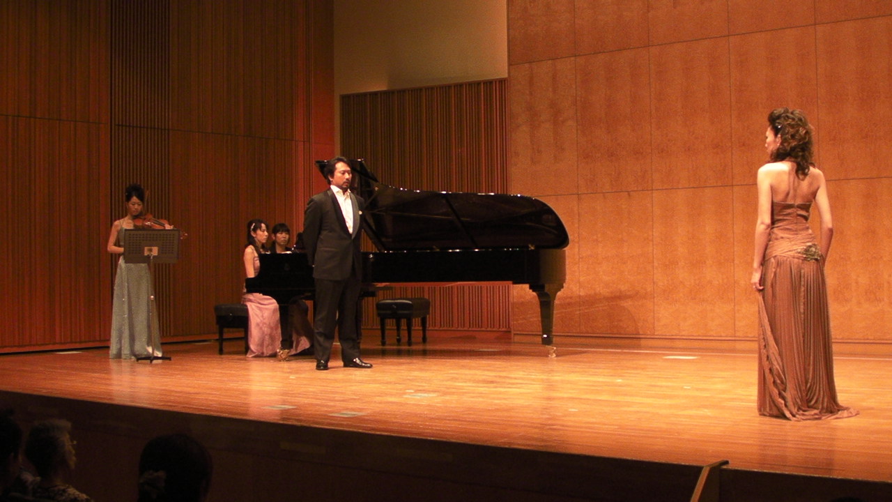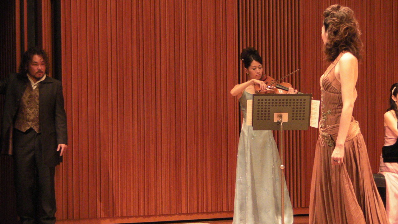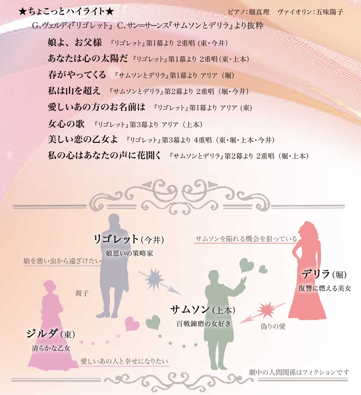 project IRIS ジョイントコンサート終了です☆ 2012/08/05(Sun) [歌いました☆] Comment (0) 本当にお暑い中、沢山の方にご来場いただき有難うございました! 今回はアンサンブルメインの大きめプログラム。 全体の構想なんかはIRISのブログで後ほど更新するとして、 私が出演した★ちょこっとハイライト★について♪ 『リゴレット』『サムソンとデリラ』より抜粋 登場人物はこんな感じ。 男性ゲストをお招きしたので、レパートリーの幅が広がりました☆ あるところにリゴレットとジルダという親子がおりました。 パパリゴレットは娘に悪い虫がつくのを嫌がっています。 ですが、ジルダちゃんは女好きのサムソンと出会い恋に堕ちてしまいます。 そこへ現れたのはダリラ(デリラ)さん。 サムソンを見つけモーションをかけるも・・・ その時ジルダに夢中のサムソンには逃げられ、女心を傷つけられた悲しみはメラメラと・・・ そんなダリラにリゴレットは「サムソンの弱みをお前の魅力で握ってくれ」と持ちかけます 一方、何にも知らないジルダちゃんは、サムソンが伝えた偽りの名前に酔いしれ・・・ またまた一方ではジルダに飽きたサムソンが他の女性を捜し求め・・・ (客席使用のためお写真は自主規制しますー) 待ち構えていたダリラにまんまとハマり、 示し合わせたリゴレットにつれてこられたジルダちゃんはその様子を見て嘆き悲しみます。 (4重唱、まだ写真がありません。後日に) そして、そして、 ダリラの罠にかかったサムソンは・・・ と、いった感じの設定でナレーションを絡めつつ、進めさせていただきました。 IRISのコンサートではオペラを普段ご覧になる方が決して多いとは言えません。 ピアノを聴きに来る方も、弦を楽しみにいらっしゃる方も、勿論歌が大好きな方にも、 オペラって歌も演技もこんなに楽しいものなんだ!と音楽と触れ合っていただきたい想いから、このようなハイライトを取り入れています。 このように本来の筋とは異なったストーリーを組み立てることに抵抗がある方もいらっしゃるかと思いますが、その点はご容赦ください (´-ω-`) 今までは15分ほどにまとめた構成を、今回は後半丸々一時間に拡大! 大変好評頂きまして何よりです♪ 個人的には色々と反省点もあるのですが・・・これは次回へのバネにして、また楽しいコンサートをお届けできるよう頑張ります! 有難うございました。 ほりまりえ PR