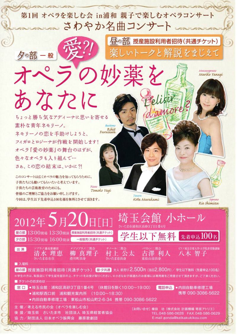さわやか名曲コンサート 2012/05/07(Mon) [音楽] Comment (0) どどん!とチラシを載せましたが、私は出演しないんです(´-ω-`) が、縁あってコチラのコンサートのお手伝いをさせて頂くことになりました☆ ディズニーリゾート第九や、先日のMの集いでご一緒させて頂いた皆様、そしていつもお世話になっているピアニスト八木智子さんが出演します♪ 八木さんには8月のリサイタルでも山形にお招き(拉致?)して共演の予定です! このコンサート、オペラの名曲、名場面を元にしたオリジナルストーリーなのですが、今までの公演のお話を聞いていても、本当に面白いんです。 オペラに馴染みがない方でも分かりやすく楽しめる、そしてオペラ大好きな方には、オイしいシーンばかりでたまらない!という夢のようなプログラム☆ ご興味ありましたら是非お出かけ下さい。 ステージモードでない私にも会えるかもしれませんw さわやか名曲コンサート ~オペラの愛?!の妙薬をあなたに~ 2012年5月20日(日) 昼の部 13:30開演 (※昼の部は、夕の部のチケットをお求めのお客様に限りご入場頂けます) 夕の部 16:00開演 @埼玉会館 小ホール 【出演】 清水理恵(ソプラノ) 柳真理子(メゾソプラノ) 村上公太(テノール) 古澤利人(バリトン) 八木智子(ピアノ) 【料金】 大人 前売り ¥2,500(当日¥2,800) 学生以下無料(先着申し込み100名)お問い合わせ下さい。 ※※※ チラシはクリックで大きくしてご覧になれます。 お求め、お問い合わせは直接でも、私に頂いてもOKですので、お気軽にご連絡くださいね。 ほりまりえ