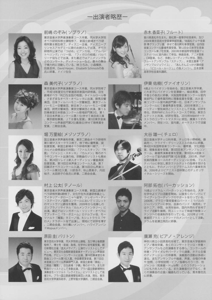 Marchだね 全員集合♪ 2011/12/12(Mon) [お知らせ] Comment (0) 以前お知らせしたMの集いコンサート チラシが出来ました☆ Mの集い ということでこの題名にw Marchだね 全員集合♪ Mの集い コンサート vol.4 2012年3月20日(火・祝) 14:00開演 めぐろパーシモンホール 小ホール 前売り券¥3,000 当日券¥3,500 【出演】 前嶋 のぞみ (ソプラノ) 森 美代子 (ソプラノ) 堀 万里絵 (メゾソプラノ) 村上 公太 (テノール) 原田 圭 (バリトン) 赤木 香菜子 (フルート) 伊東 佑樹 (ヴァイオリン) 大谷 雄一 (チェロ) 廣瀬 充 (ピアノ・アレンジ) 阿倍 拓也 (パーカッション) 今回は第4回のコンサート。 前回までの音源も聞かせて頂きましたが、ユニークな選曲、そして器楽・パーカッションもはいった迫力の音♪ 今からとっても楽しみです。 お申し込み、お問い合わせはコチラまで。 ブログ左のメールフォームからもお求め頂けます。 どうぞお気軽にご連絡下さい。 ほりまりえ PR