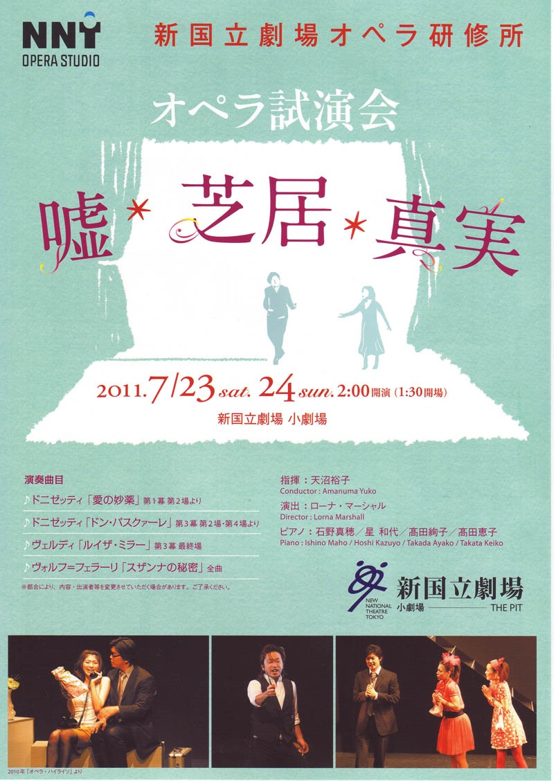 オペラ試演会 2011/07/22(Fri) [音楽] Comment (0) 昨日新国立劇場オペラ研修所の試演会GPを見に行きました。昨年まで出演していたステージ。観客として鑑賞するのは何だか不思議な気分です。本番は明日からの2日間。修了して思うのは、とても恵まれた環境で勉強できたということ。研修中は勿論ですが、外に出て改めてそう感じています。皆がんばれ( ´ ▽ ` )ノ ほりまりえ