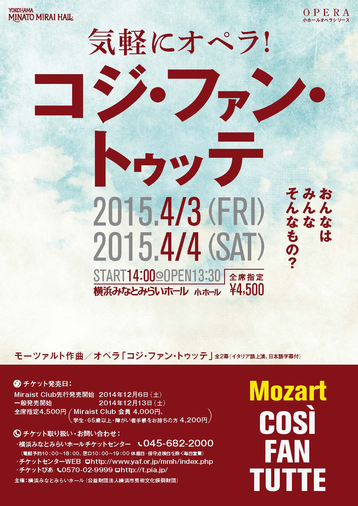 | W.A.モーツァルト『コジ・ファン・トゥッテ』 ドラベッラ役 2015年4月3日(金)14:00開演 2015年4月4日(土)14:00開演 横浜みなとみらいホール 小ホール 全席指定 ¥4,500 指揮/チェンバロ:田島亘祥 演出:今井伸昭 フィオルディリージ:針生美智子 ドラベラ:堀万里絵 フェランド:大川信之 グリエルモ:増原英也 デスピーナ:鷲尾麻衣 ドン・アルフォンソ:鹿野由之 ピアノ:朴令鈴 |