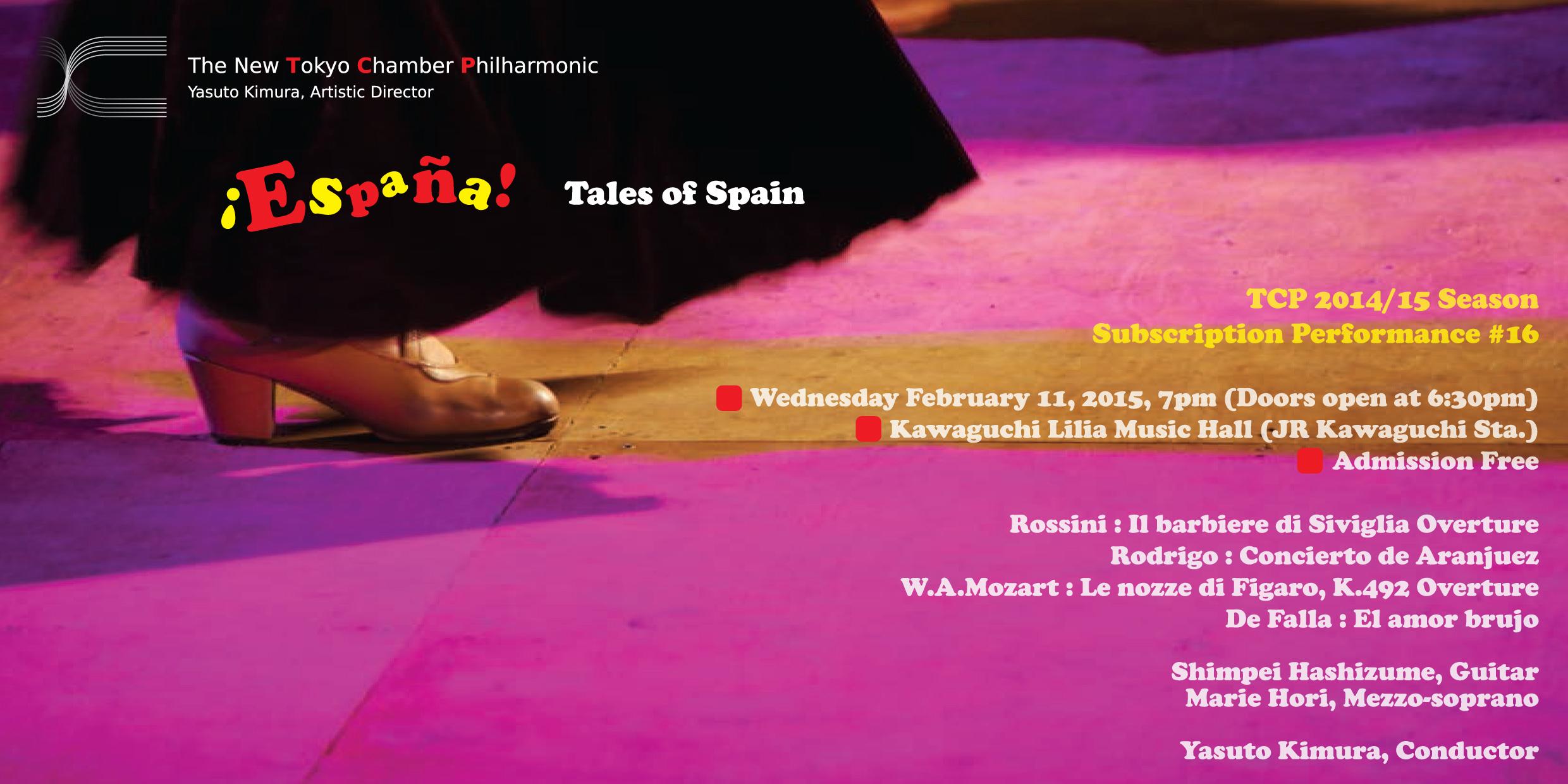 | チェンバー・フィルハーモニック東京 第16回演奏会 『España! Tales of Spain』 ファリャ『恋は魔術師』ソリスト 2015年2月11日(火・祝) 19:00開演 川口総合文化センターリリア 音楽ホール 入場無料 (TCP創立記念特別価格) 指揮:木村康人 ギター:橋爪晋平 メゾソプラノ:堀万里絵 主催WEBページ http://tokyochamberphol.org/ |