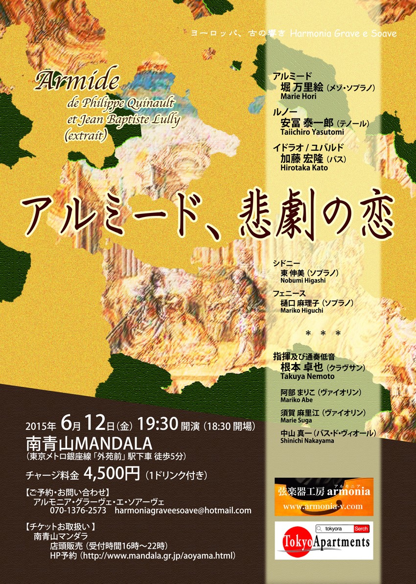 | ヨーロッパ 古の響き Harmonia grave e soave J-B.リュリ『アルミード』 タイトルロール 2015年6月12日(金) 19:30開演(18:30開場) 南青山MANDALA(東京メトロ銀座線「外苑前」駅下車 徒歩5分) チャージ料 ¥4,500(1ドリンクつき) 指揮/クラヴサン:根本卓也 ヴァイオリン:阿部まりこ ヴァイオリン:須賀麻里江 バス・ド・ヴィオール:中山真一 アルミード:堀万里絵 ルノー:安冨泰一郎 イドラオ/ユバルド:加藤宏隆 シドニー:東伸美 フェニース:樋口麻理子 |