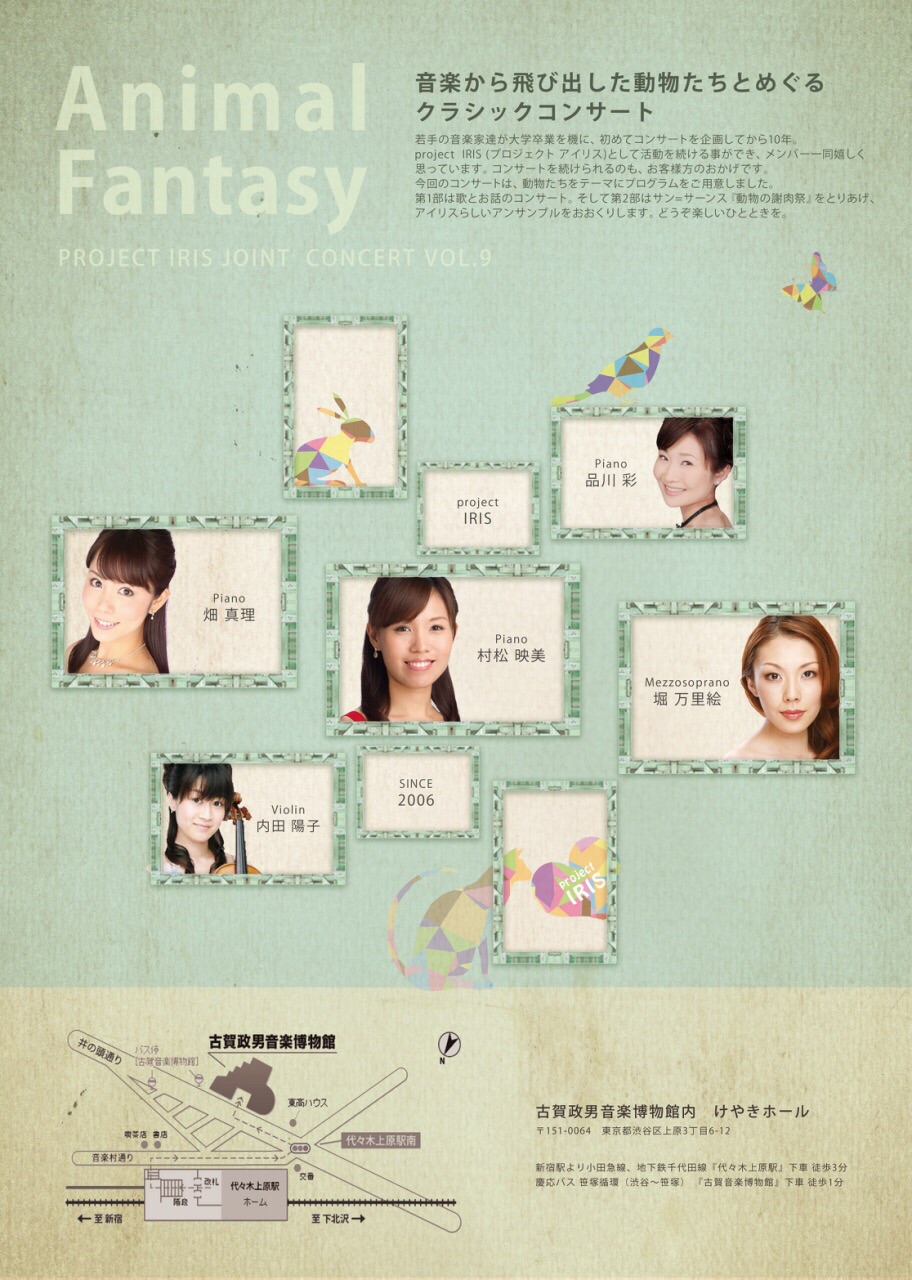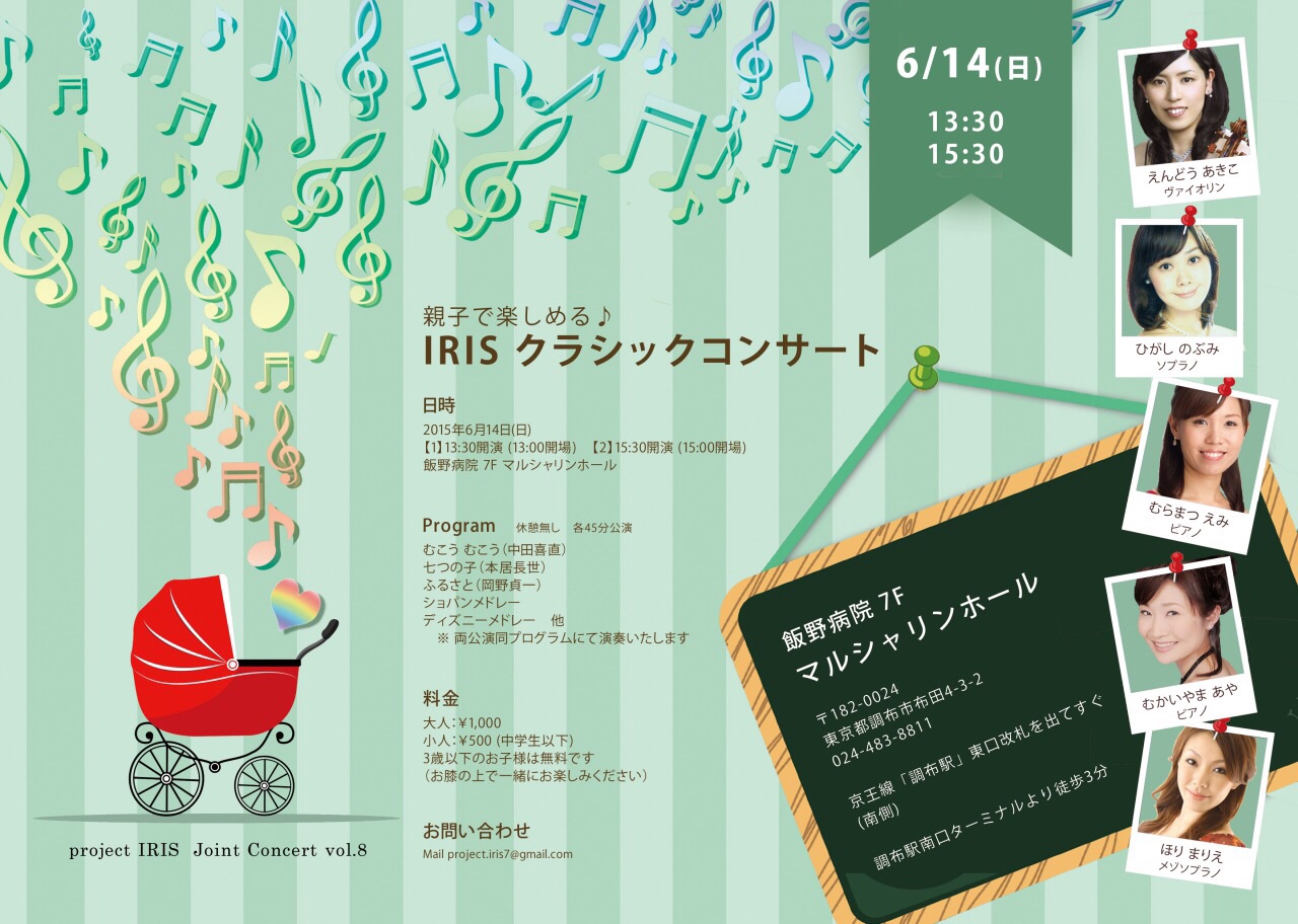 | project IRIS Joint Concert vol.8 親子で楽しめる♪ IRIS クラシックコンサート 2015年6月14日(日) 13:30開演 (13:00開場) 2015年6月14日(日) 15:30開演 (15:00開場) 飯野病院7F マルシャリンホール 大人:¥1,000 小人:¥500(中学生以下) 3歳以下のお子様は無料(お膝の上でご一緒にお楽しみください) えんどうあきこ (ヴァイオリン) ひがしのぶみ (ソプラノ) ほりまりえ (メゾソプラノ) むらまつえみ (ピアノ) むかいやまあや (ピアノ) 休憩無し 45分のミニコンサート。 IRISのアンサンブルナンバーやお子様に聞かせたい日本語の歌、お話を交えてお届けします。 |