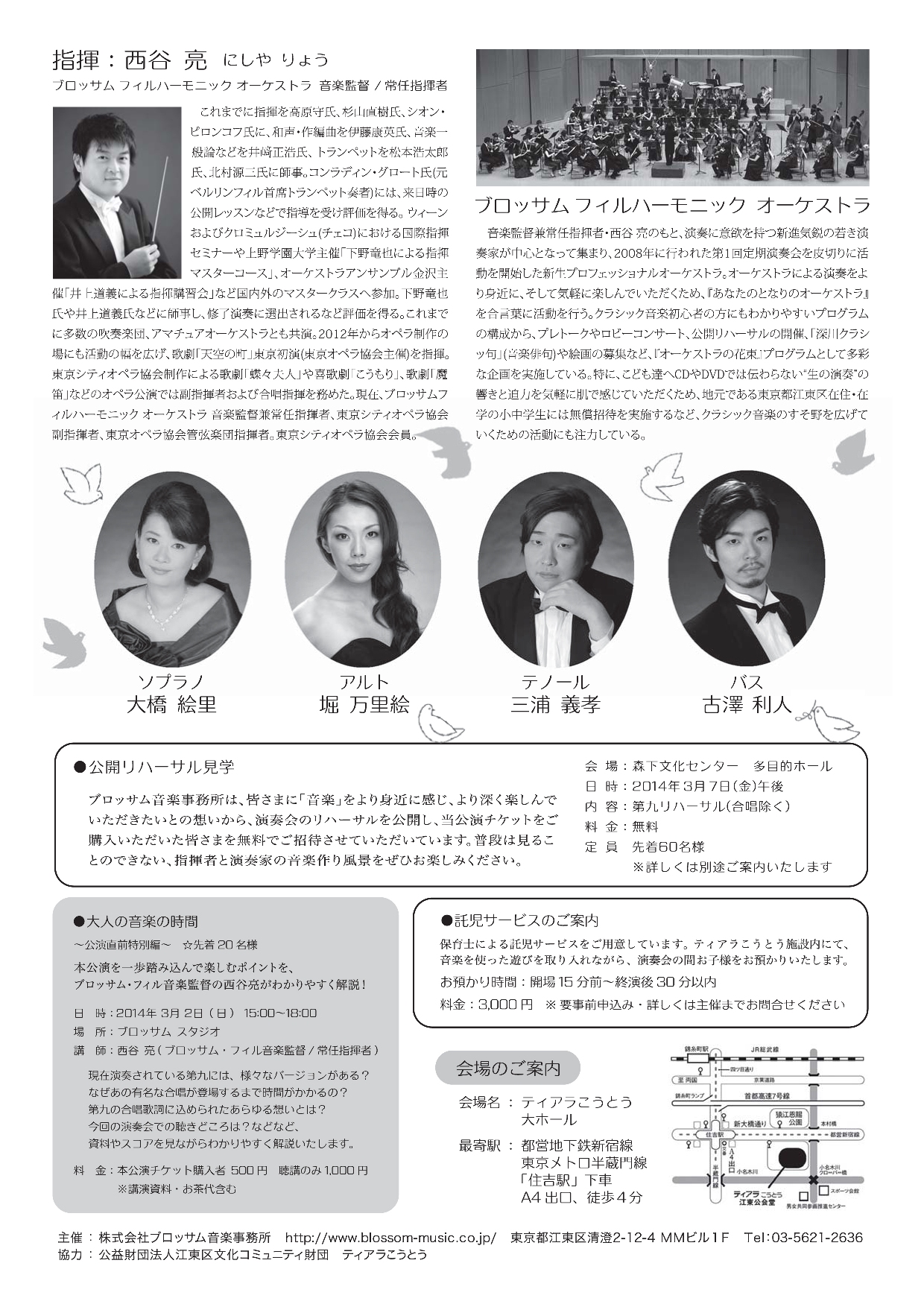 ベートーヴェン『交響曲第9番 合唱付き』 2014/02/13(Thu) [お知らせ] Comment (0) みなさま年末のイメージが強いと思いますが。 『第九』です♪ ※クリックで大きくご覧いただけます。 ブロッサムフィルハーモニックオーケストラ 第8回定期公演 東日本大震災復興祈念 ベートーヴェン『交響曲第9番 合唱付き』 2014年3月9日(日) 14:00開演 (13:15開場) ティアラこうとう 大ホール 【チケット】 全席指定 一般:¥4,000 65歳以上:¥3,000 高校生以下:¥1,500 江東区在住在勤:¥3,500 江東区小中学生:無料招待(2階席) ※13:30より ロビーコンサート ※13:45より 指揮者によるプレトーク 【出演】 指揮:西谷 亮 管弦楽:ブロッサム フィルハーモニック オーケストラ 合唱:ブロッサムフィルと第九を歌う会 ソリスト ソプラノ:大橋 絵里 アルト:堀 万里絵 テノール:三浦 義孝 バス:古澤 利人 ★★★★★★★★★★★★★★★★★★★★★★★★★★★ 東日本大震災復興祈念。。。 あれからもう3年が経とうとしてるんですね。 色々自分自身にも変化はあったけど、今こうして歌っていられる環境を考えると、普通に生活出来ることが、なんて恵まれているんだろうと改めて感じます。 ハ音記号が読めない とか アレンジが追いつかない とか 寒くて家から出たくないとか 着て行く服が決まらない とか そんな小さな事いってられませんね。 がんばります。 ちなみにそろそろ雛祭りです。 実家の母から 「飾ったよー」 と写真が届きました。 パカパカ携帯で撮ったっぽいので、画像は悪いんですが… わたし、実はずっと不満があったんです。 どうしてわたしのお雛様はお扇子を開いていないんだろう…って。 ほら、こんなやつ。 髪型も2つ結いだし、もしかして時代設定?とかによって違うのかしら??? これは去年のお写真★ 4段目に置いてある【万里絵】の絵馬的なやつ(名称が分からん!)はオルゴール。 もう古くて、ネジまいても あの雛祭りのメロディーがブッツブツと途切れてしまうけど、自分のお雛様っていくつになっても嬉しいですね。 えぇ、たとえ30代でも、女の子♪♪♪ 今年も実家に帰って直接見ることは出来ないけど、ちゃんと毎年飾ってくれるマリママ、マリパパ。 どうもありがとう。 お雛様を見ると気分が春モードになりませんか? 週末はまた大雪予報ですが… 早くあったかくならないかなぁ~!!!! ほりまりえ PR