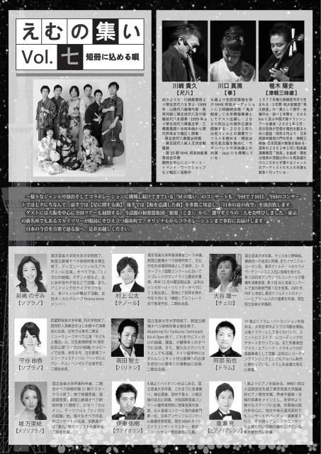 スケジュール 2013年 2010/01/03(Sun) [出演履歴] Comment (0) 【2013年】 春の夜会(アパルトマン) Harmonia grave e soave 2013年1月30日(水) ヴァレンタインコンサート Mの集いvol.5 2013年2月14日(木) 魅惑の室内楽 コミクストゥスジャパン第2回公演 2013年2月19日(火) 2013年2月22日(金) 『北原ミレイ物語~歌こそ我が人生~』 2013年4月27日(土) 『虹色コンサート』 project IRIS jointo concert vol.6 2013年6月22日(土) えむの集いコンサート vol.七~短冊に込める唄~ 2013年7月6日(土) 新しい子供の歌コンサート 2013年8月24日(土) 二期会アフタヌーンコンサート 2013年8月28日(水) MARIE et musique vol.2 2013年8月31日(土) 『想』~マラン・マレ、オペラから生まれた室内楽~ Harmonia grave e soave 2013年9月3日(火) 宵月コンサート 2013年9月9日(月) ラヴェル『シェエラザード』 TBSK管弦楽団第2回定期演奏会 2013年10月20日(日) ぼれぇ・かんた~れ 2013年11月4日(月) コンサート出演 2013年11月6日(水) モーツァルト『フィガロの結婚』 藤沢市民オペラ 2013年11月16日(土) 2013年11月23日(土) Mの集いコンサート Vol.8 2013年12月6日(金)18:30 音の虹色たまてばこ project IRIS クリスマスコンサート 2013年12月11日(水) 近江楽堂ランチタイムコンサート Harmonia grave e soave 2013年12月19日(木) ビゼー『カルメン』抜粋 中野区民合唱団 第21回定期演奏会 2013年12月22日(日) ベートーヴェン『第九』 2013年12月27日(金) ほりまりえ PR